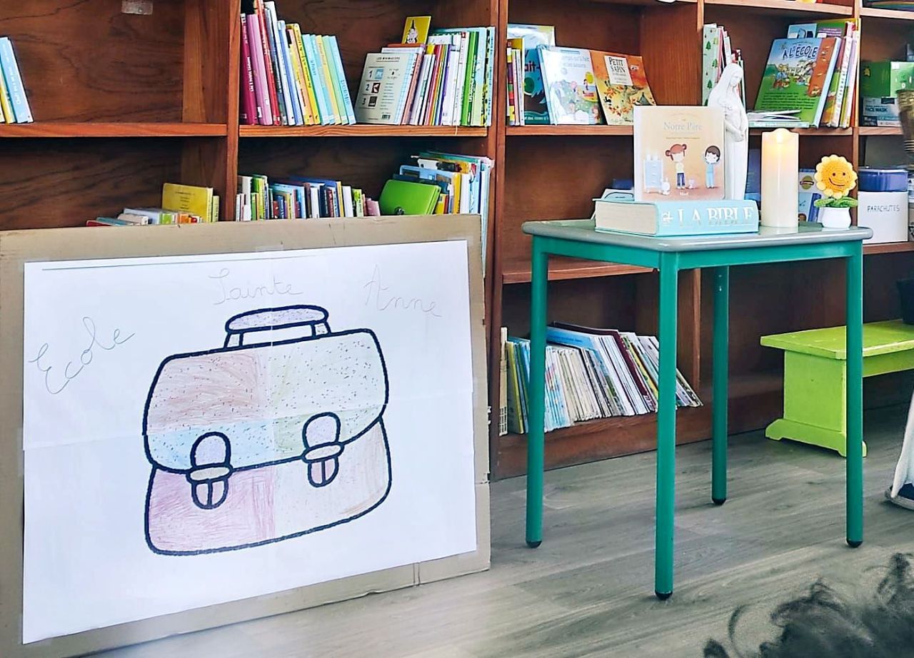 Un grand cartable, placé au centre, représentait à la fois celui de chaque enfant et toute l’année à venir.